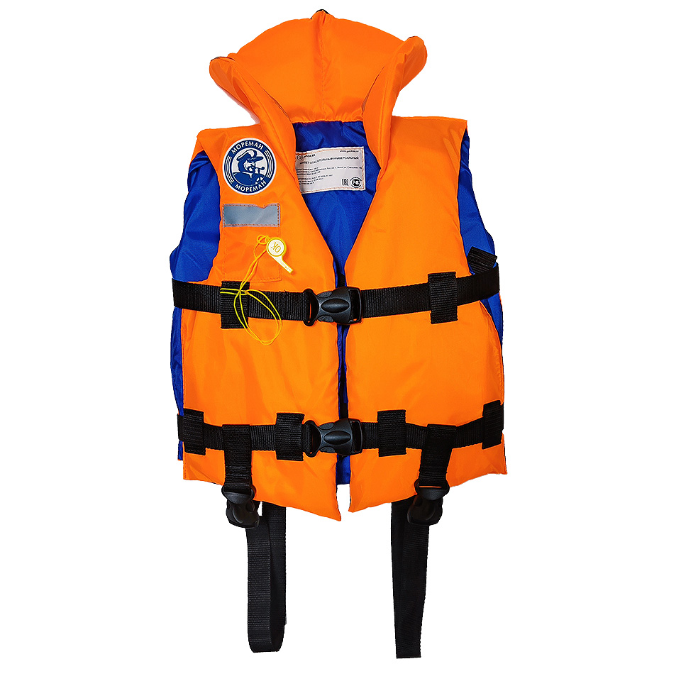 Спасательный универсальный жилет, рассчитан на вес до 50 кг с подголовником и светоотражающими элементами.