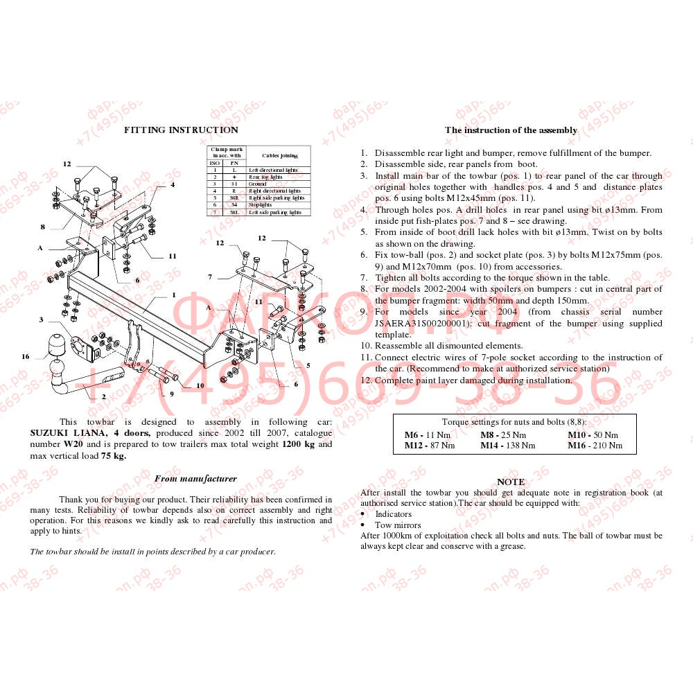 Фаркоп для Suzuki Liana седан 2002-2007. Без подрезки бампера. Тип шара: A. Нагрузки: 1200/75 кг, масса фаркопа 17,1 кг