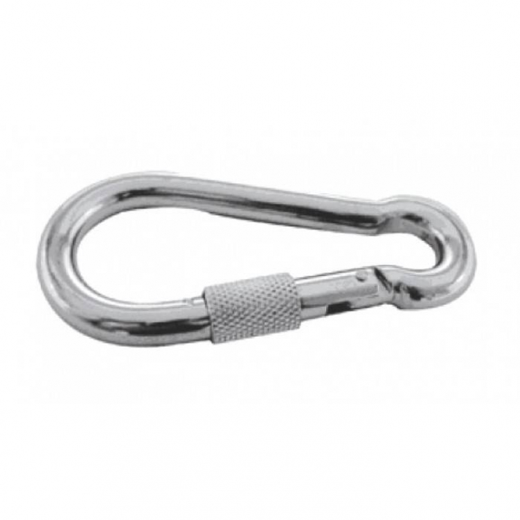 Гак-карабин с винтовым фиксатором и подпружиненной защёлкой крепится к концу тросов и цепей, служащий для подъема шлюпок, груза, а также для буксировки.