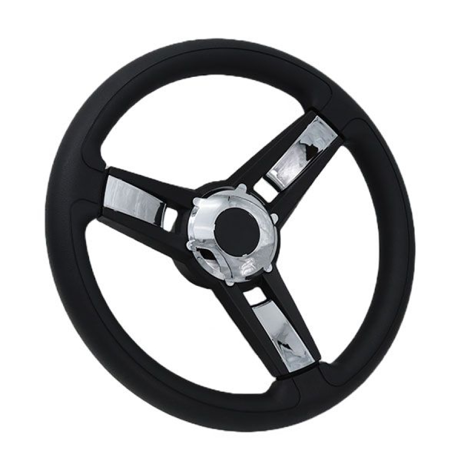 Рулевое колесо от итальянского производителя Gussi выполнено из полиуретана в современном стиле и представляет собой отличное соотношение цены и качества. Колесо доступно со вставками из хрома, матового хрома или серого цвета, а также в базовой версии полностью в черном цвете.
