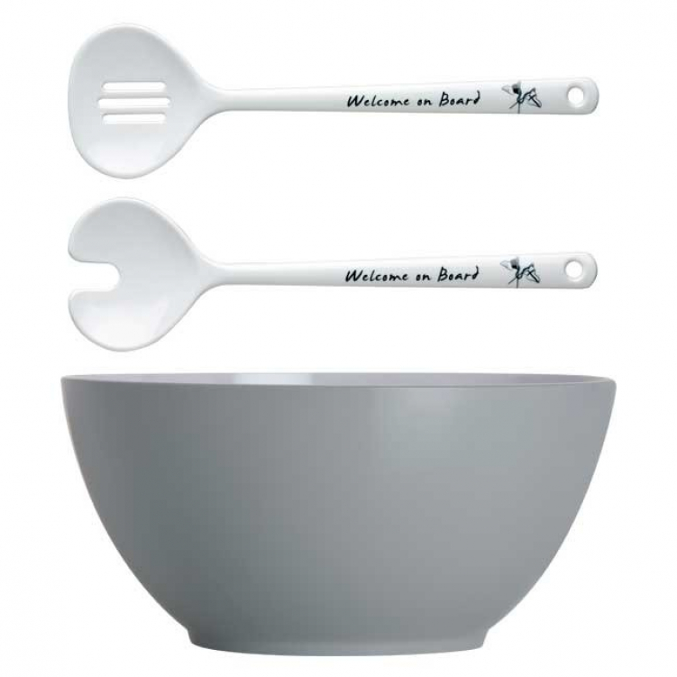 Миска для салата и две салатные ложки, изготовденные из меламина — стойкого к ударам и царапинам керамоподобного пластика. Миска имеет резиновый ободок на дне, препятствующий скольжению по поверхности стола.
