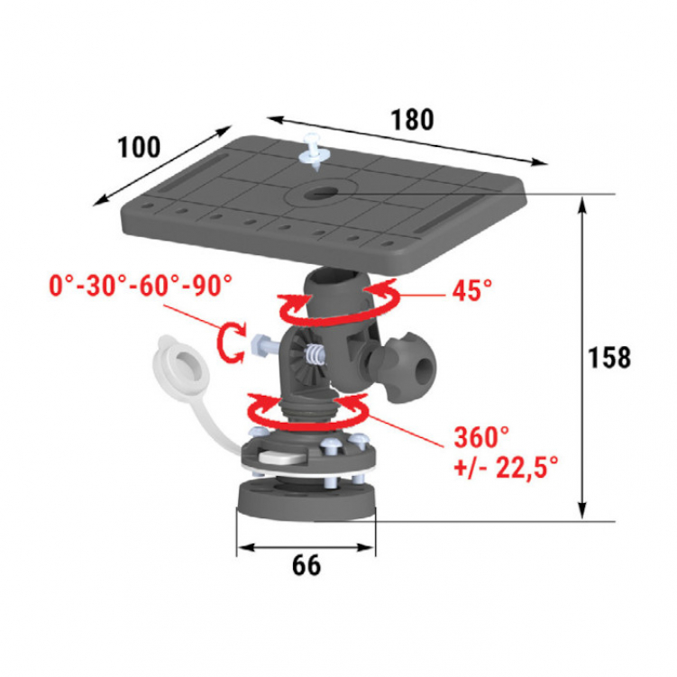 Площадка на палубу-переборку быстросъемная используется для монтажа различного дополнительного оборудования (эхолоты, фото-видеоаппаратура и другие устройства). Изделие оснащено механизмом регулировки угла наклона. Площадка сконструирована с учетом, расположением крепежных отверстий большинства видов оборудования. Изготовлена из высокопрочного полиамида.