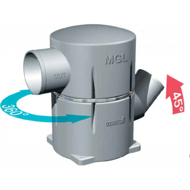 Водяной замок с поворотным корпусом для «мокрых» выхлопных систем мощных двигателей. Обеспечивает безопасный для двигателя слив воды из выхлопных шлангов при выключении зажигания, а также эффективное глушение шума выхлопа. Снабжен шаровым краном для слива влаги перед зимней консервацией. Для дополнительного глушения шума в линию выхлопа могут быть добавлены муфлер и гусек.