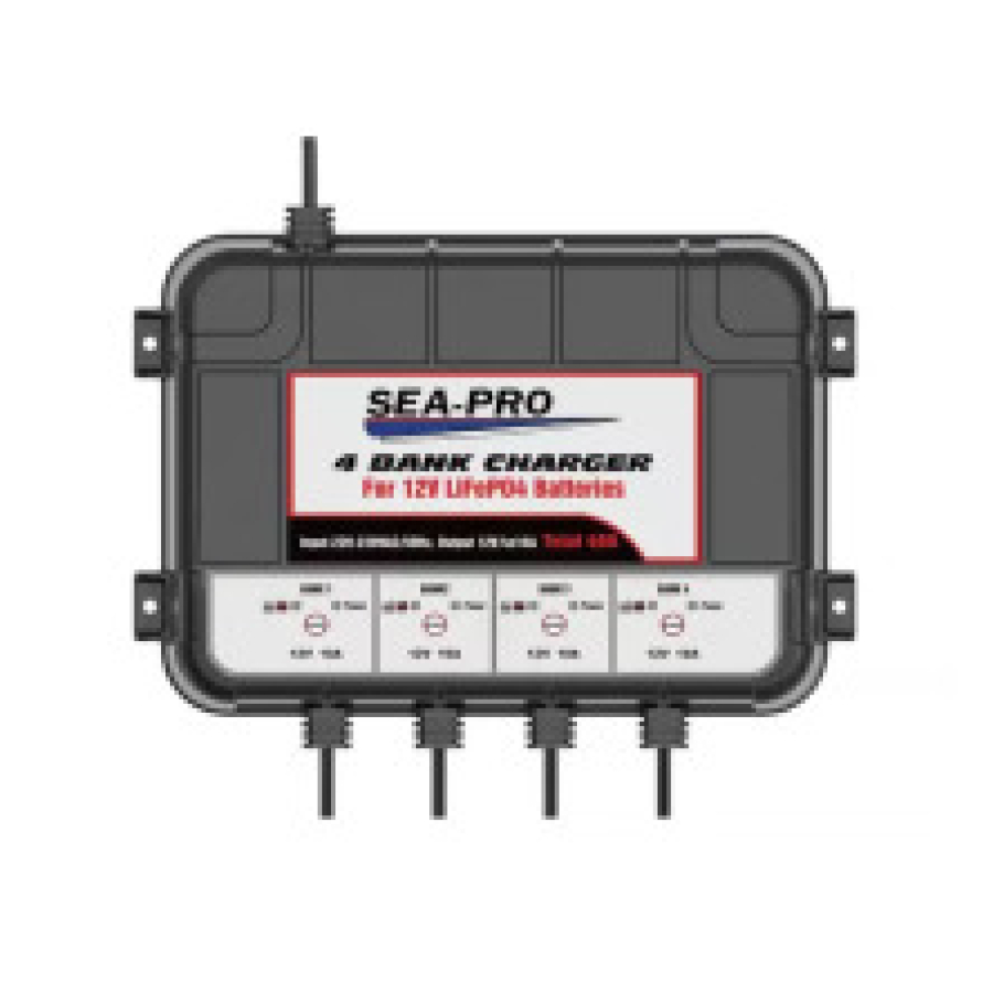 Зарядное устройство Sea-Pro ТЕ4-0274 (4х12В LiFePo4) - модель морского исполнения с защитой от проникновения влаги IP67 имеет 4 выходных порта для зарядки напряжением 12В и током 10A на каждый LiFePo4 аккумулятор, обеспечивая таким образом корректную и полную зарядку в автоматическом режиме сразу четырех LiFePOL4 аккумулятора.