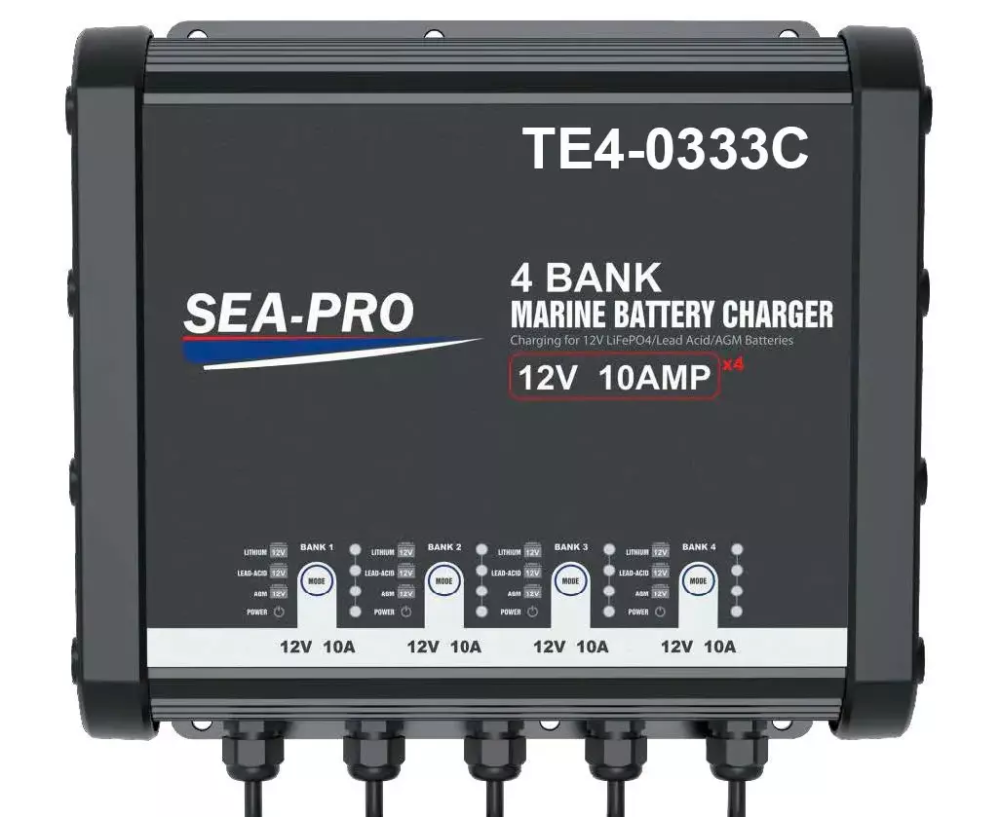Зарядное устройство Sea-Pro ТЕ4-0333С (4х12В AGM, LEAD-ACID, LiFePo4) - модель морского исполнения с защитой от проникновения влаги IP67 имеет 4 выходных порта для зарядки напряжением 12В и током 10A на каждый аккумулятор. Подходит для любого типа АКБ (AGM/LEAD-ACID/LiFePo4).