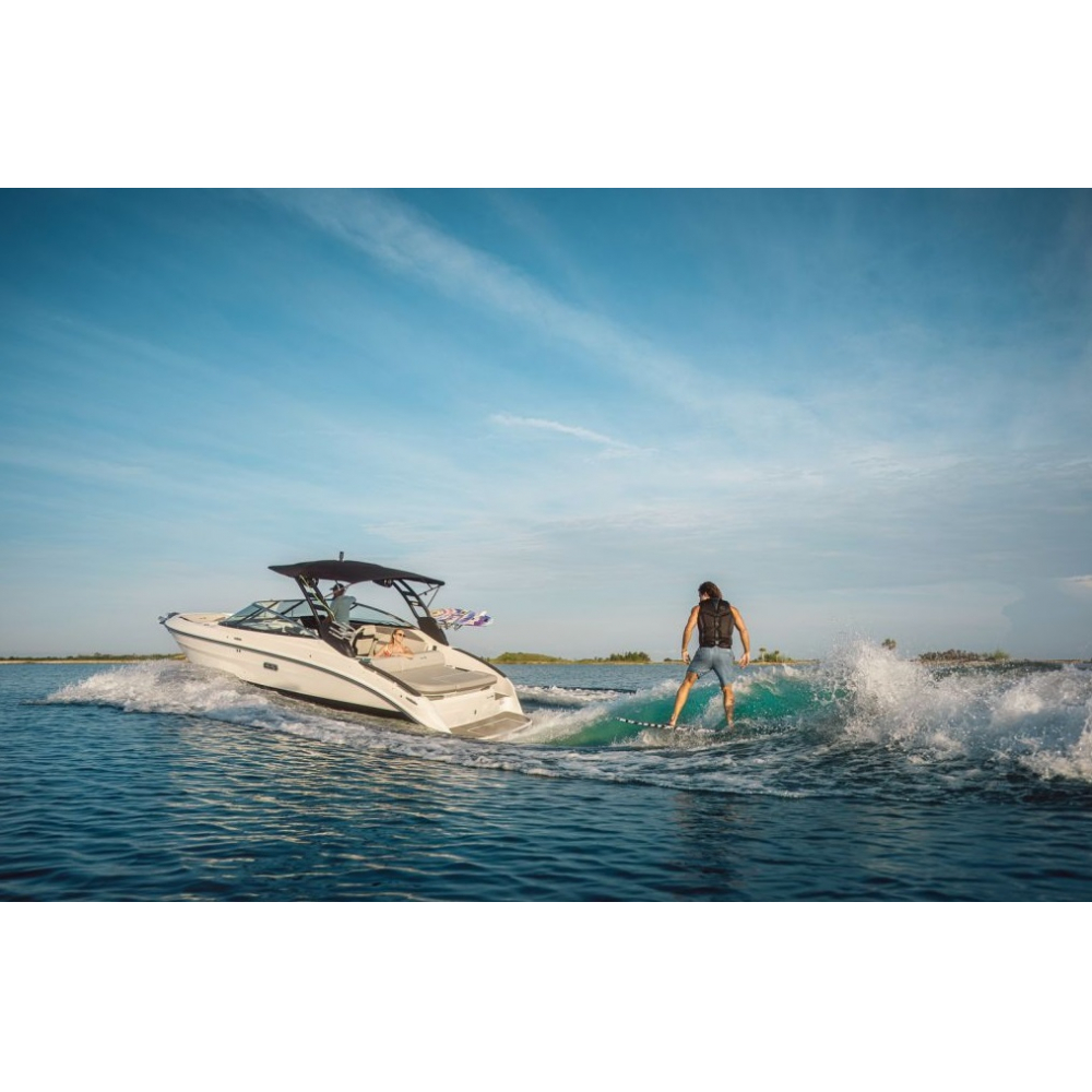 На катер ставится арка для водных видов спорта с выдвижным бимини-топом, закрывающим кокпит. Ее положением управляют при помощи электропривода. На опорах арки можно закрепить две доски и динамики аудиосистемы Fusion Signature, входящие в пакет Entertainment Premier Audio, а в пакете Lighting доступна светодиодная подсветка RGB-W с изменением цвета и проекцией логотипа Sea Ray.