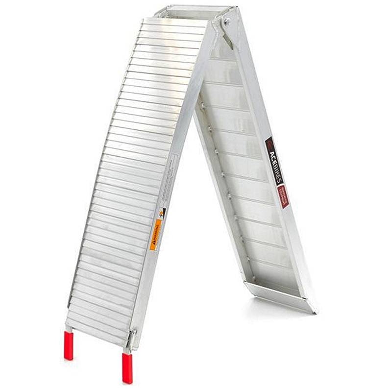 Foldable Ramp Эта складная погрузочная рампа - чрезвычайно прочная и лёгкая рампа, изготовленная из высококачественного алюминия для погрузки мотоциклов на прицеп, фургон или транспортер. Подходит для всей мототехники весом до 340 кг.
