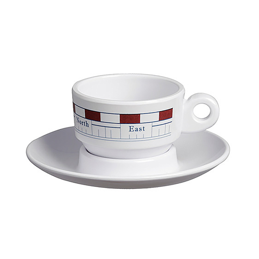 Чашка из меламина (стойкого к ударам и царапинам керамоподобного пластика) в комплекте с блюдцем. Чашки при хранении компактно вставляются друг в друга, занимая минимум места. Специальный ободок на блюдце предотвращает соскальзывание чашки. 6 пар (чашка + блюдце) в наборе. Цена за набор.