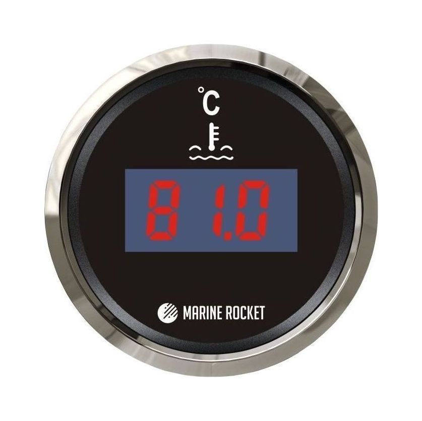 Указатель температуры двигателя цифровой 25-120 гр., черный циферблат, нержавеющий ободок, д. 52 мм, Marine Rocket.