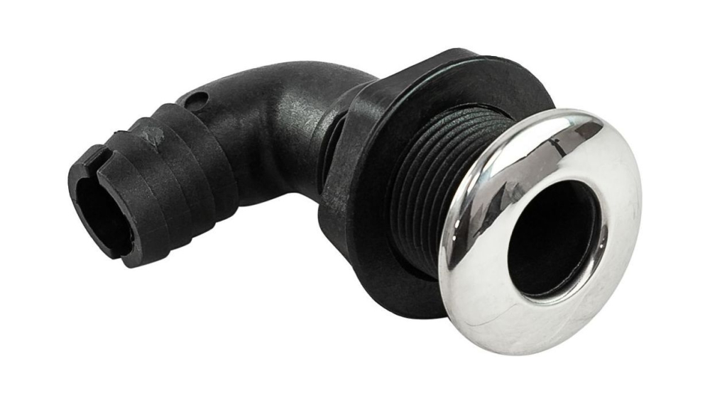Разъем водосброса угловой пластиковый с крышкой из нержавеющей стали под шланг 25,4 мм, черный.