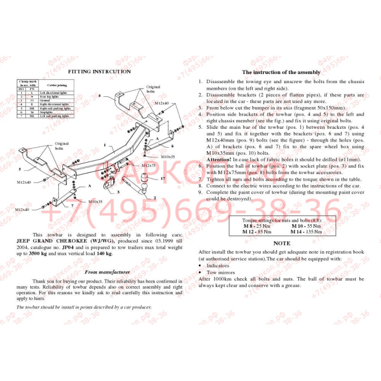 Фаркоп для Jeep Grand Cherokee WJ 1999-2005. Требуется подрезка бампера. Тип шара: A. Нагрузки: 3500/140 кг, масса фаркопа 23,6 кг