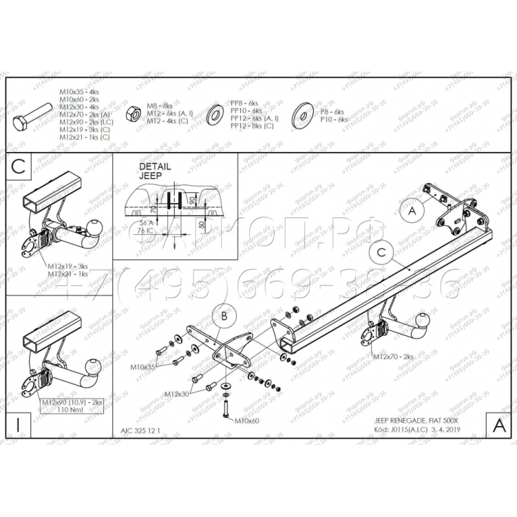 Полностью ОЦИНКОВАННЫЙ фаркоп на Jeep Renegade 2014-, FIAT 500X 2014- Тип шара: C (горизонтальный съемный). Требуется вырез в бампере. Нагрузки: 1750/100 кг, масса фаркопа 16,52 кг