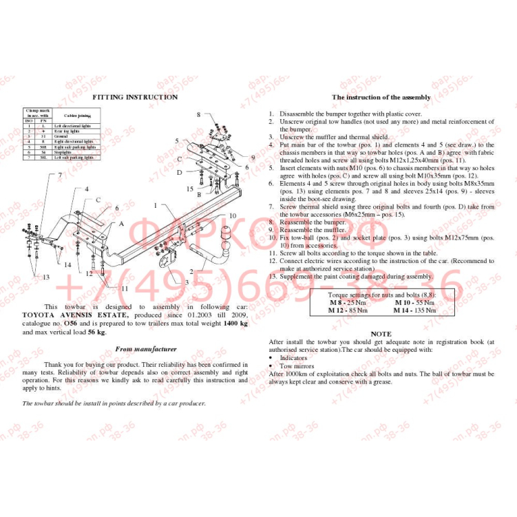Фаркоп для Toyota Avensis универсал T25, T26 2003-2009. Без подрезки бампера. Тип шара: A. Нагрузки: 1550/75 кг, масса фаркопа 17,5 кг