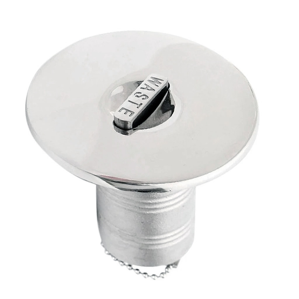 Палубные заливные горловины. Надписи «Fuel» (топливо), «Diesel» (дизельное топливо), «Waste» (сточные воды) на заливной пробке. Изготовлена из нержавеющей стали (AISI 316). Верхняя часть горловины (фланец и пробка) отполированы.