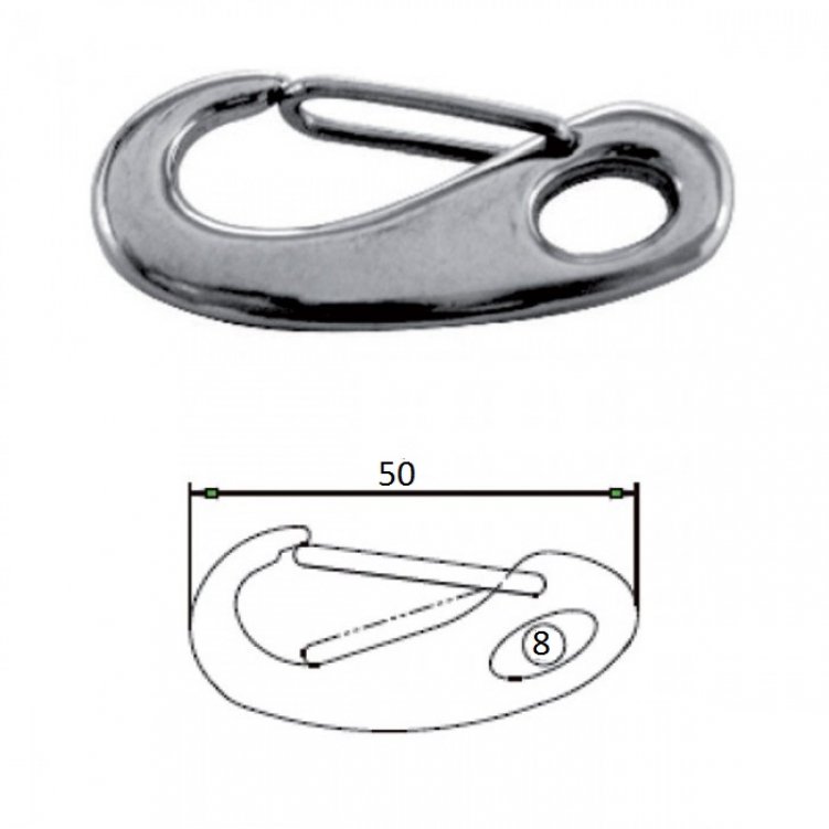 Карабин изготовлен из нержавеющей стали, с применением специального пружинного фиксатора для более удобного и безопасного соединения канатов, швартовых и т.д.