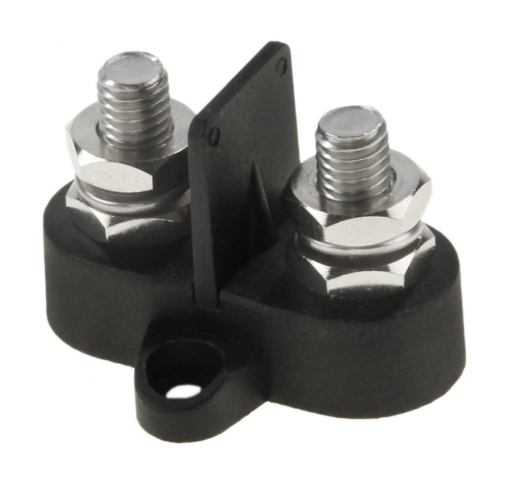 Клемма минусовая двойная с резьбовым зажимом и перегородкой. Основание клеммы изготовлено из армированного нейлона, контактная группа из никелированной латуни.