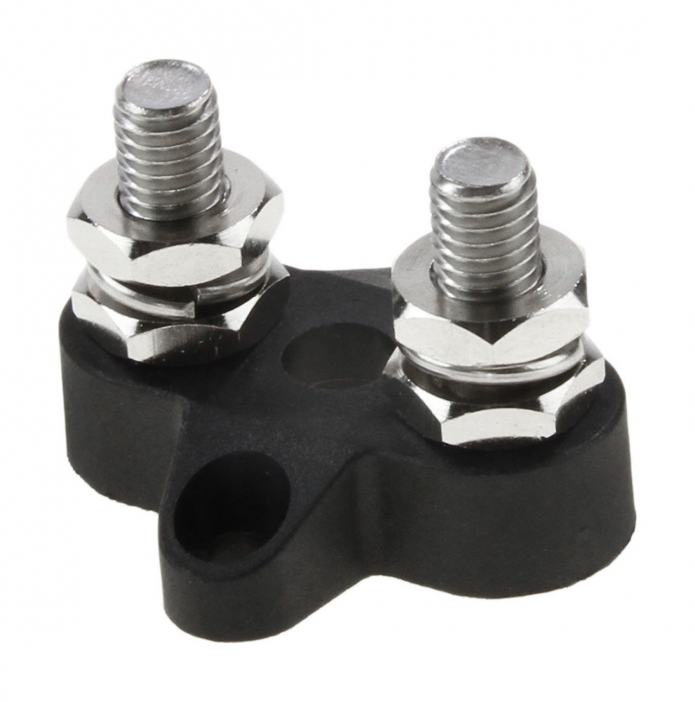 Клемма минусовая двойная с резьбовым зажимом. Основание клеммы изготовлено из армированного нейлона, контактная группа из никелированной латуни.