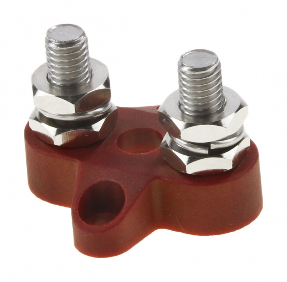Клемма плюсовая двойная с резьбовым зажимом. Основание клеммы изготовлено из армированного нейлона, контактная группа из никелированной латуни.