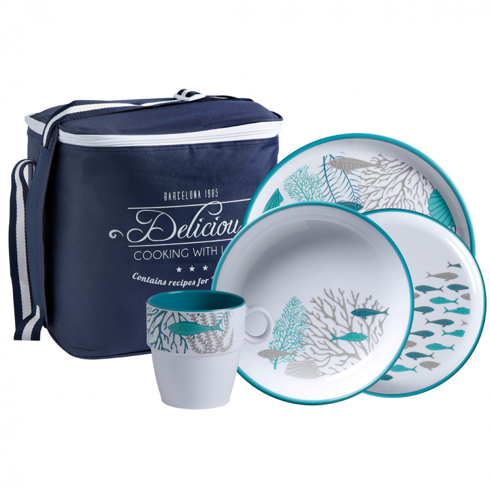 Набор посуды для четырех человек. Четыре большие плоские тарелки, четыре десертные тарелки, четыре суповые миски, четыре кружки. Изготовлены из меламина - стойкого к ударам и царапинам керамоподобного пластика.