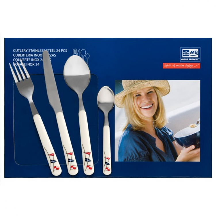 Набор из 24 столовых приборов из высококачественной нержавеющей стали с пластиковыми рукоятками (вилка, ложка, нож, чайная ложка — по 6 шт). Не забудьте приобрести в дополнение набор кофейных ложек «Moka». Цена за набор.