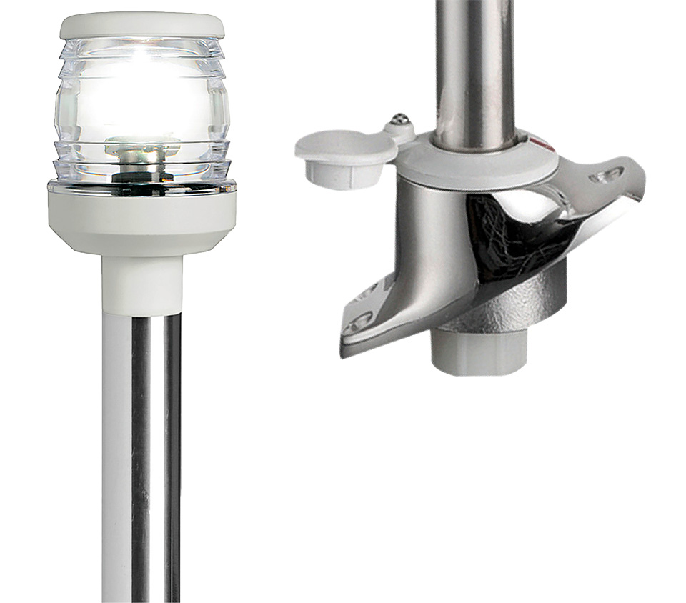 Белый навигационный огонь с дугой освещения 360 градусов на съемной стойке высотой 600 мм. В комплекте поставляется гнездо с электрическими контактами и защитной крышкой. Используется в качестве стояночного (якорного) огня. Правила допускают использование его в качестве универсального ходового огня на гребной лодке и парусной яхте длиной менее 7 метров (в этом случае, требуется еще и фонарь для освещения парусов, который включают при приближении другого судна). Линза Френеля способствует распределению светового потока в горизонтальной плоскости, что увеличивает дальность видимости огня при неизменной мощности лампы.
