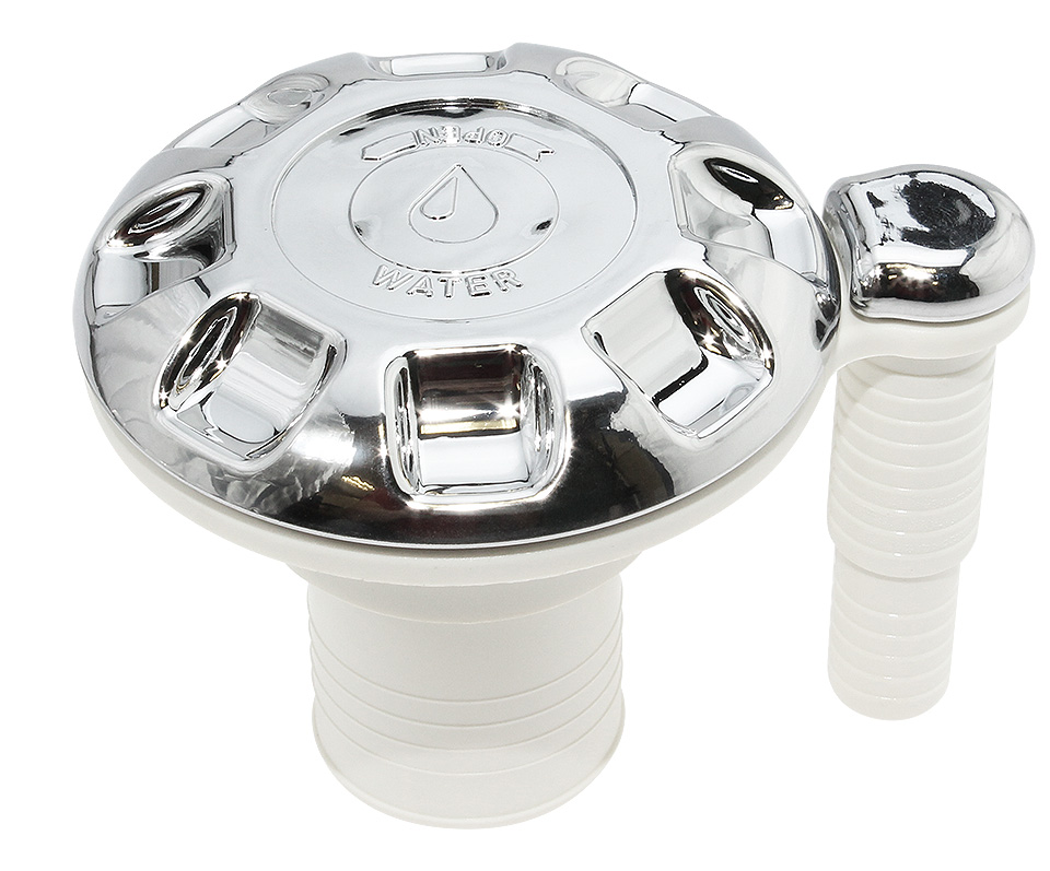 Палубная горловина, объединенная с вентиляционным патрубком. Надпись "water" (вода) на крышке. Патрубок под шланг с внутренним диаметром 38 мм. Вентиляционный патрубок под шланг с внутренним диаметром 19-20 мм. Два варианта: белая и хромированная.