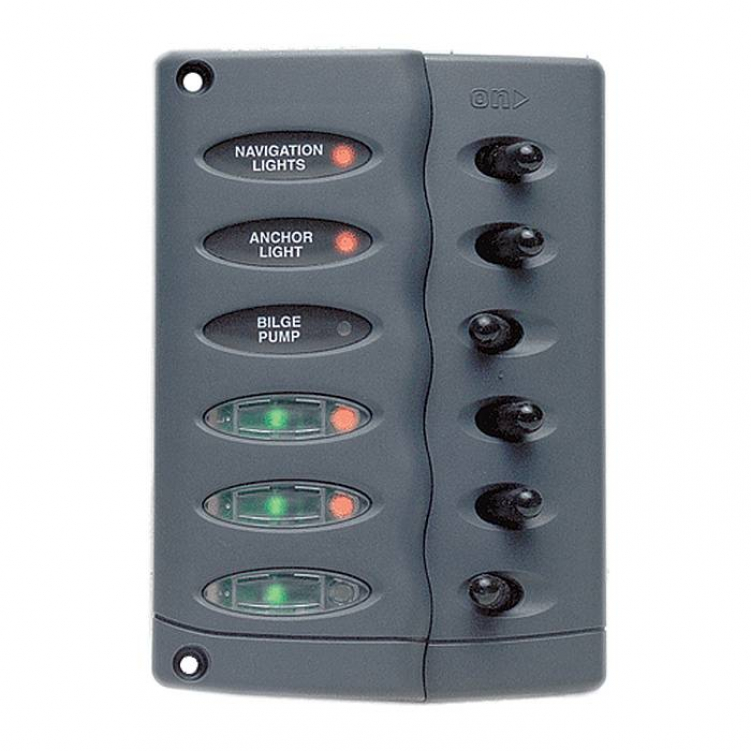 Панель оборудована зеленой подсветкой шильд и оснащена шестью герметичными двухпозиционными переключателями 20 А в неопреновых колпачках и съемной передней панелью (стандарт водозащищенности IP56).