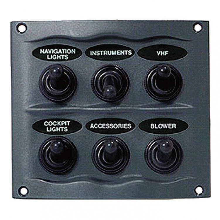 Панель оснащена шестью герметичными двухпозиционными переключателями в резиновых колпачках, шестью брызгозащищенными патронами с предохранителями (стандарт водозащищенности IP56).