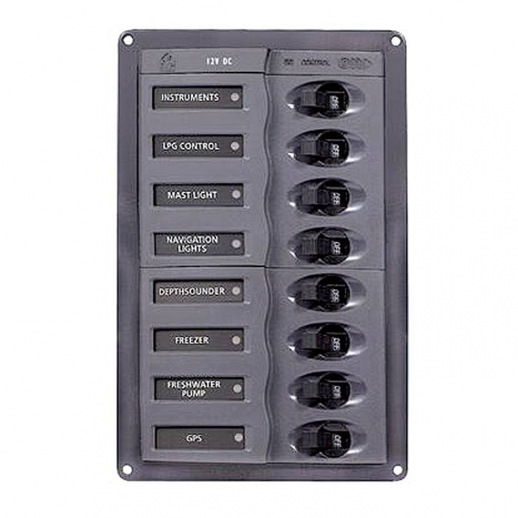 Оснащена восемью переключателями-предохранителями постоянного тока "Airpax" с пределами срабатывания 5, 10, 15 и 20 А. Оборудована зеленой светодиодной подсветкой шильд и красными индикаторами включения.