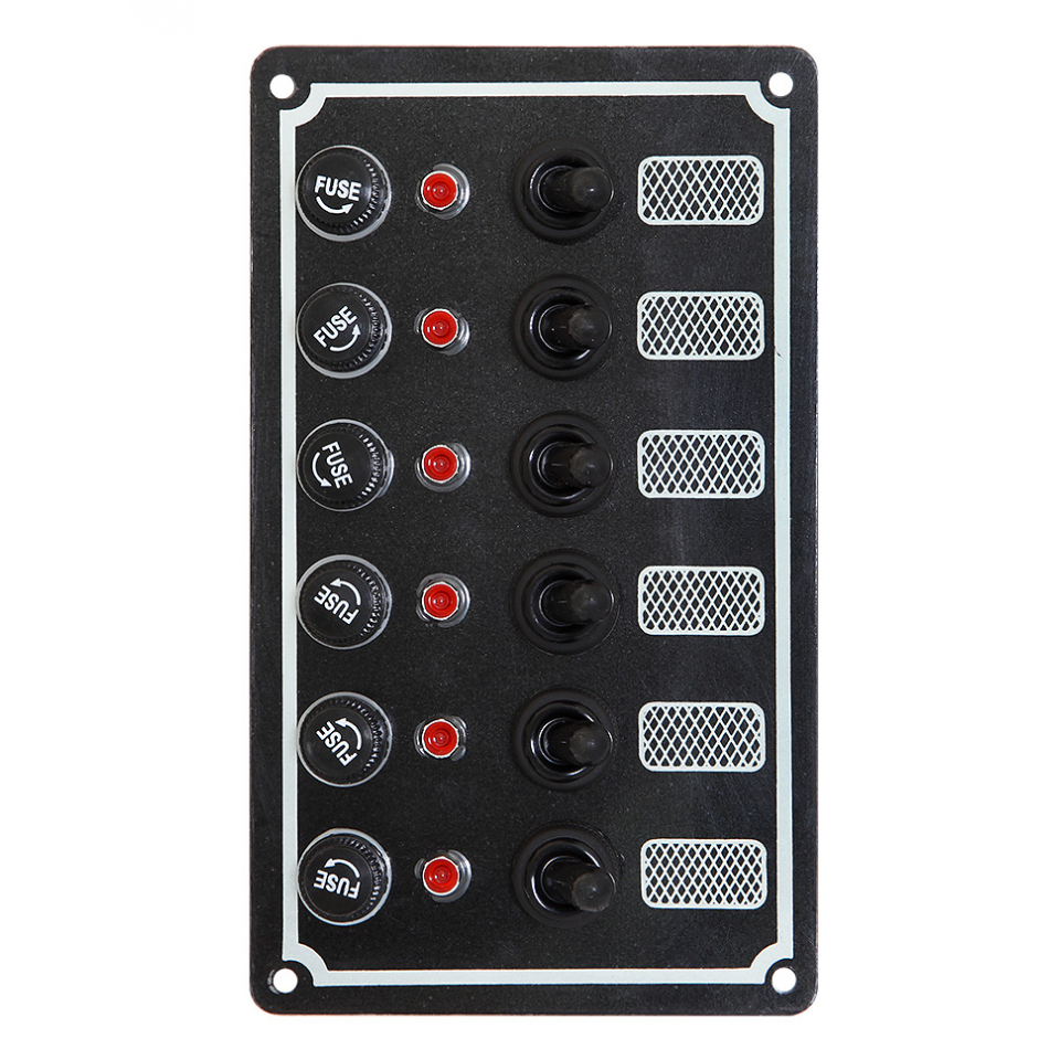 Новинка! Черное алюминиевое основание. 5 или 6 тумблеров, защищенных резиновыми колпачками. Светодиодные индикаторы включения. Гнезда под плавкие предохранители.