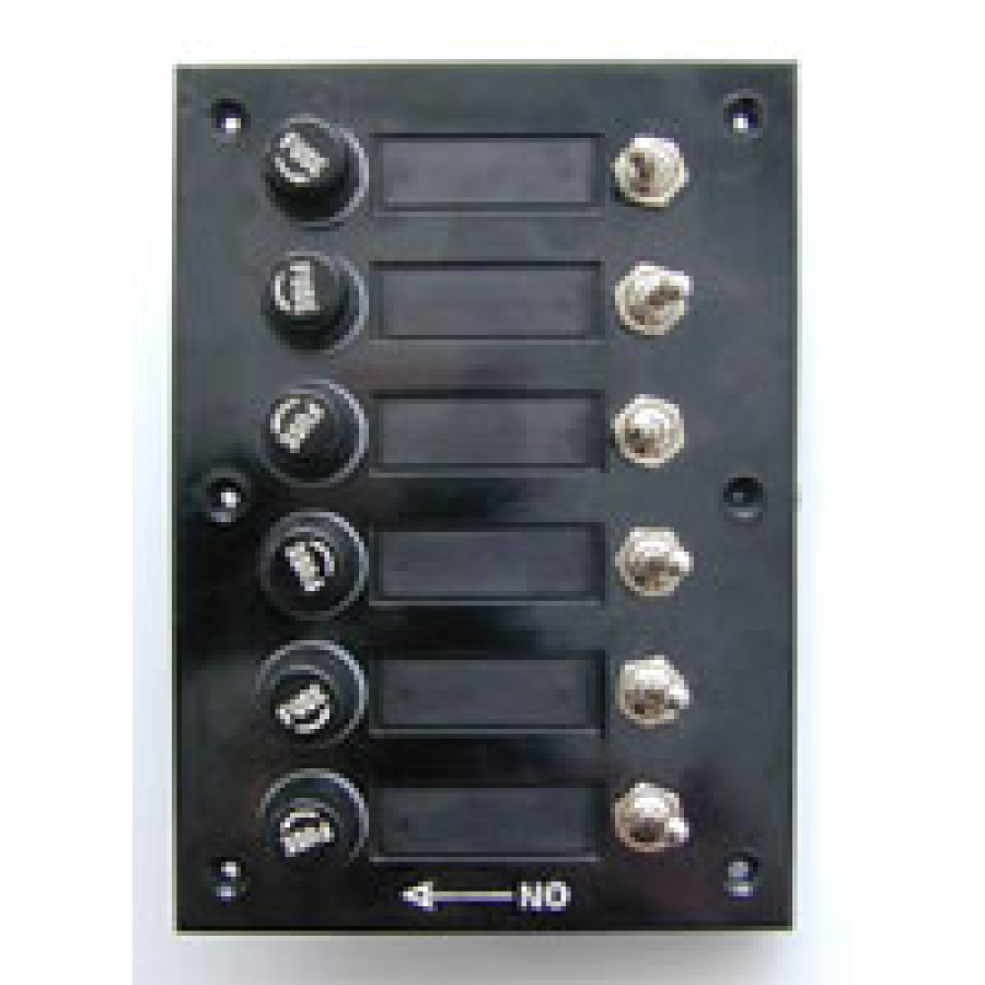 Панель из черного пластика (толщина 5 мм) с четырьмя крепежными отверстиями по периметру. Шесть плавких предохранителей и шесть тумблеров с табличками: