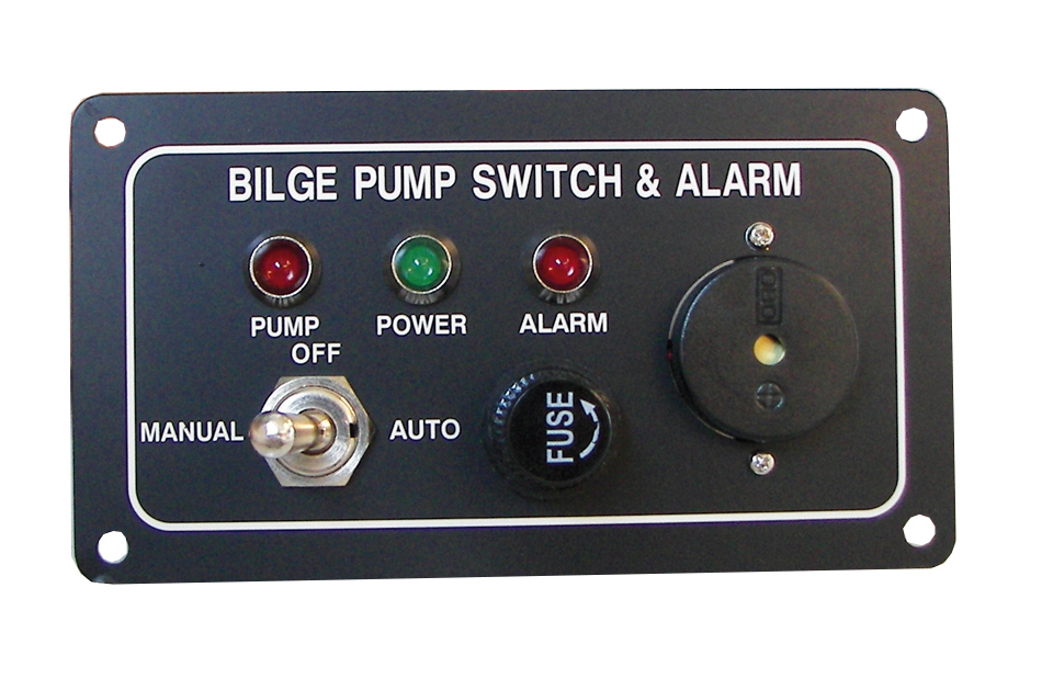 Панель управления трюмной помпой. Оборудована гнездом под плавкий предохранитель, светодиодной индикацией режимов работы помпы и дополнительно — звуковой сигнализацией срабатывания помпы (зуммер). Два варианта — панель для помпы, работающей только в автоматическом режиме и панель с возможностью выбора режимов работы (ручное включение и автоматический режим).