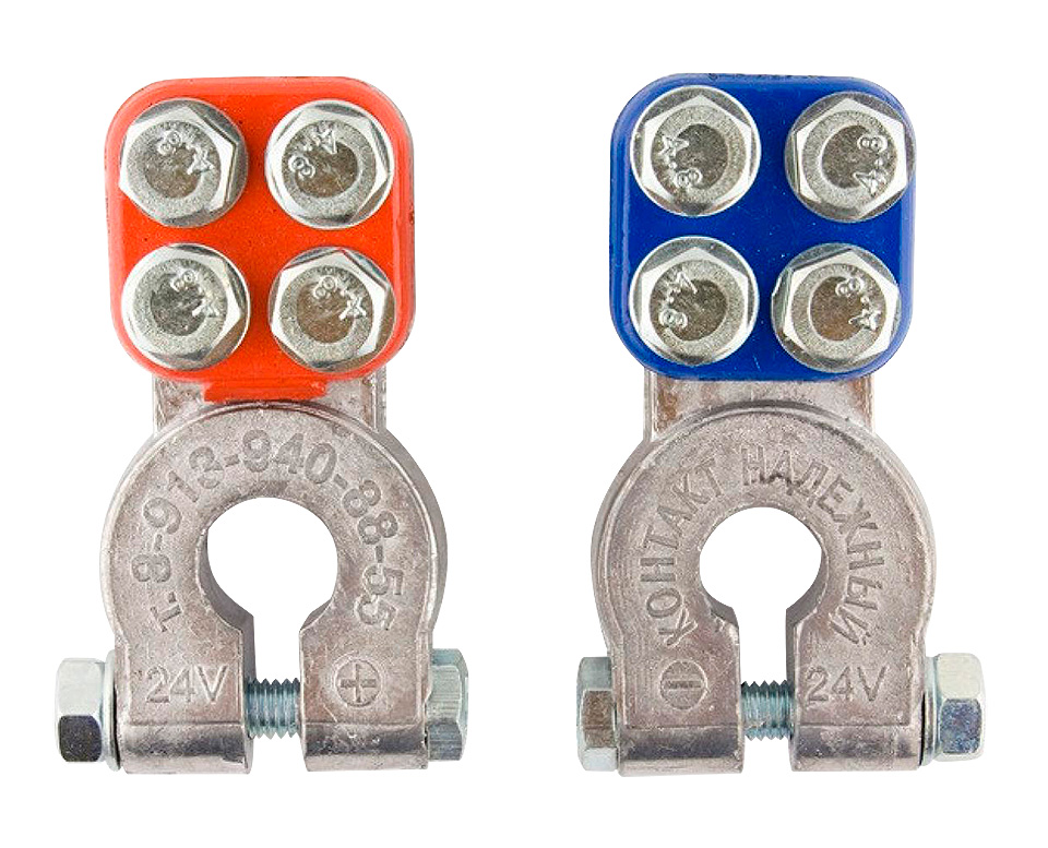 Клеммы для аккумуляторной батареи усиленные с четырьмя болтовыми зажимами и гайками для крепления электрических кабелей. Для простоты использования, колодки клемм со вставками красного и синего цвета.