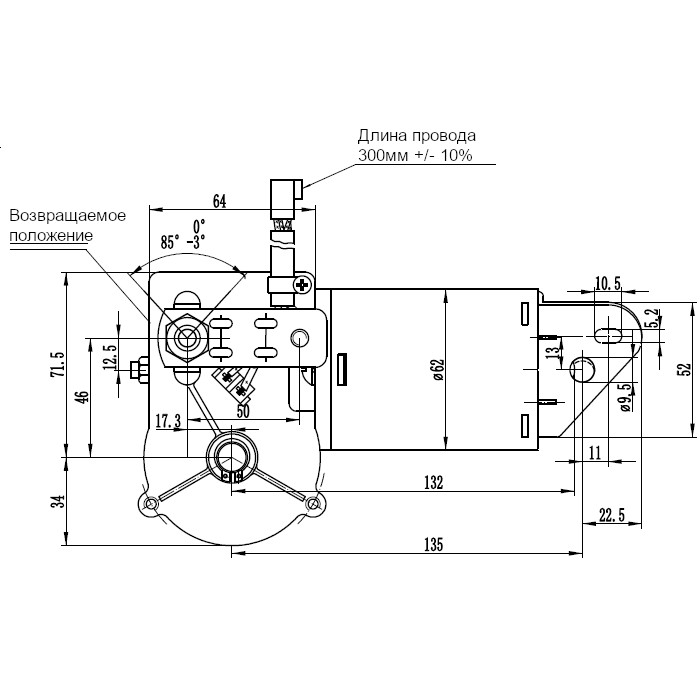 Электропривод стеклоочистителя W.E с адаптером, длина резьбы 50мм, посадка М8-10, 45-50-85-105°, 24В