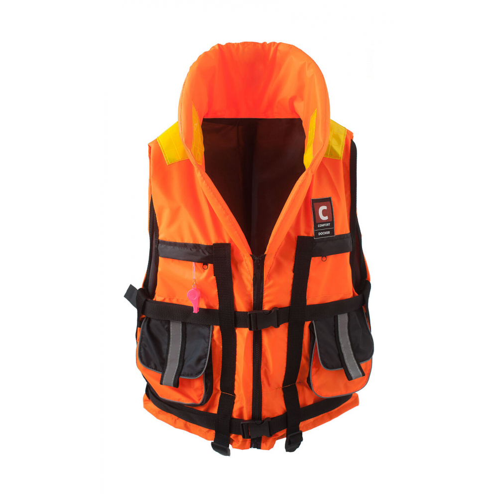 Спасательный жилет COMFORT DOCKER оснащен съемным паховым ремнем, свистком, водостойкими светоотражающими полосами в верхней части, удерживающим подголовником, ременными стропами с защелками типа «фастекс», молнией «трактор» и ярлыком с указанием номера сертификата соответствия и ТУ производителя соответствующего требованиям нормативных документов по ГОСТ 58108-2019.