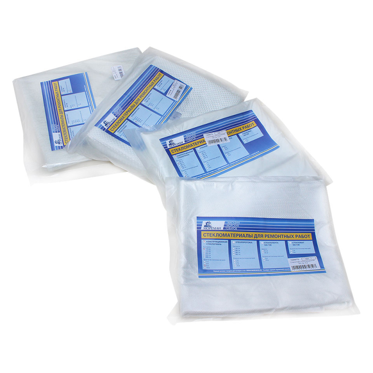 Армирующие стекломатериалы для работы с эпоксидными и полиэфирными смолами. Используются в ремонтных работах и для изготовления разнообразных изделий из стеклопластика. Различные варианты плотности (указана как вес одного квадратного метра ткани) и нарезки.