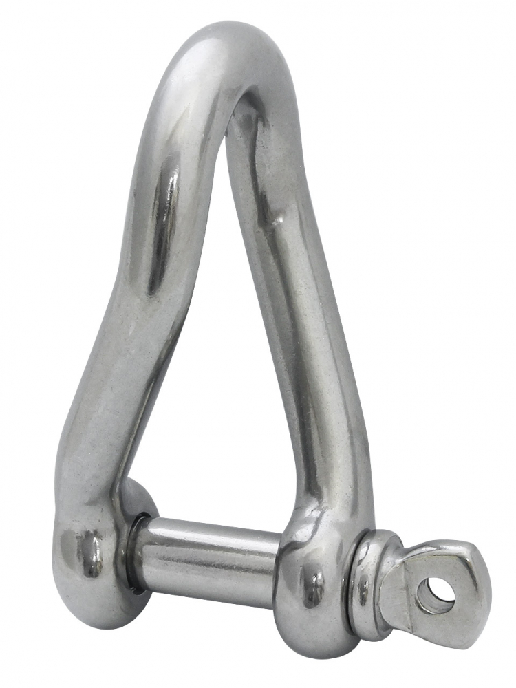 Удлиненная такелажная скоба из полированной нержавеющей стали, повернутая на 90 градусов. Изготовлена методом ковки.
