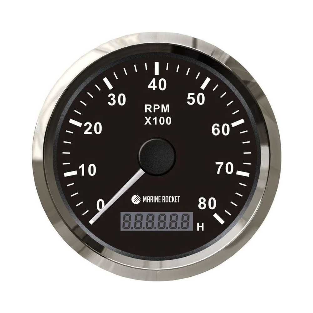 Тахометр 0-8000 об/мин со счетчиком моточасов делитель 0.5-250, черный циферблат, нержавеющий ободок, Marine Rocket.
