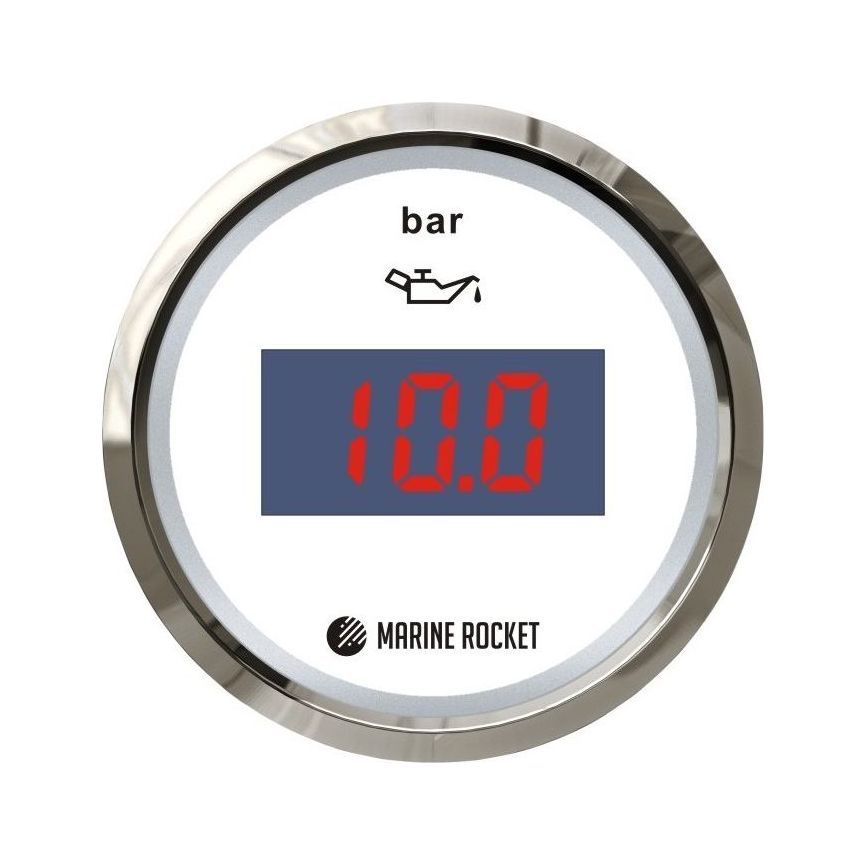 Указатель давления масла цифровой 0-5 бар, белый циферблат, нержавеющий ободок, д. 52 мм, Marine Rocket.<br>Указатель давления масла. Предназначен для контроля за давлением в масляной системе двигателя. Используется шкала измерений с пределом в 5 бар.<br><br>Характеристики:<br>Примечание: * Подсветка прибора может быть как красной так и желтой, цвет зависит от варианта подключения контактов (см. схему подключения питания).<br>Диапазон измерений: 0-5 бар<br>Цвет: белый<br>Модель: CEPR-WS-0-5<br>Подсветка прибора: *красная/желтая<br>Важно: *При напряжение бортовой сети катера 24В установка резисторов в цепь питания прибора ОБЯЗАТЕЛЬНА!.<br>Степень защиты IP: 67/65<br>Гарантия производителя: 1 год.<br>Диаметр прибора: 56<br>Монтажный вырез: 52<br>Бренд: Marine Rocket<br>Страна производителя: Китай<br>Сигнал (диапазон): 10-184 Ом<br>Рабочее напряжение, DC: 12 (24*)