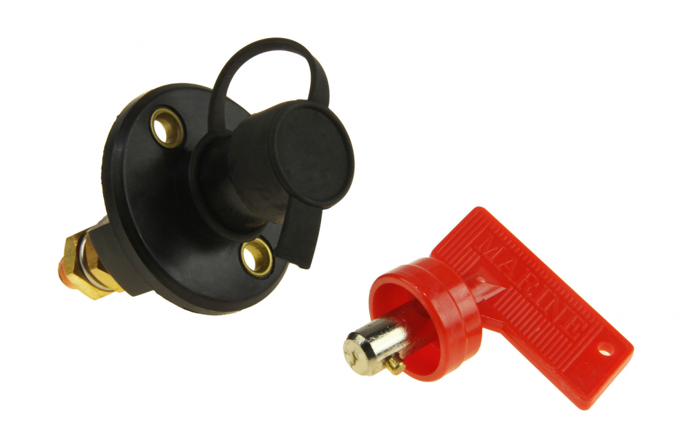 Выключатель массы в пластиковом корпусе с защитным колпачком и съемным ключом.