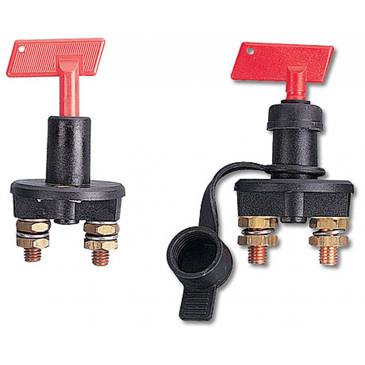 Выключатель массы с брызгозащитной крышкой на ток до 500 ампер Выключатель массы в пластиковом корпусе, рассчитанный на ток до 500 ампер. Предотвращает разряд аккумуляторов через возможные паразитные электрические цепи во время долгой стоянки судна. Может использоваться для аварийного обесточивания бортовой сети. Поставляется также в варианте с резиновой брызгозащитной крышкой.