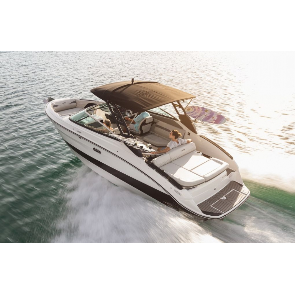 На катер ставится арка для водных видов спорта с выдвижным бимини-топом, закрывающим кокпит. Ее положением управляют при помощи электропривода. На опорах арки можно закрепить две доски и динамики аудиосистемы Fusion Signature, входящие в пакет Entertainment Premier Audio, а в пакете Lighting доступна светодиодная подсветка RGB-W с изменением цвета и проекцией логотипа Sea Ray.
