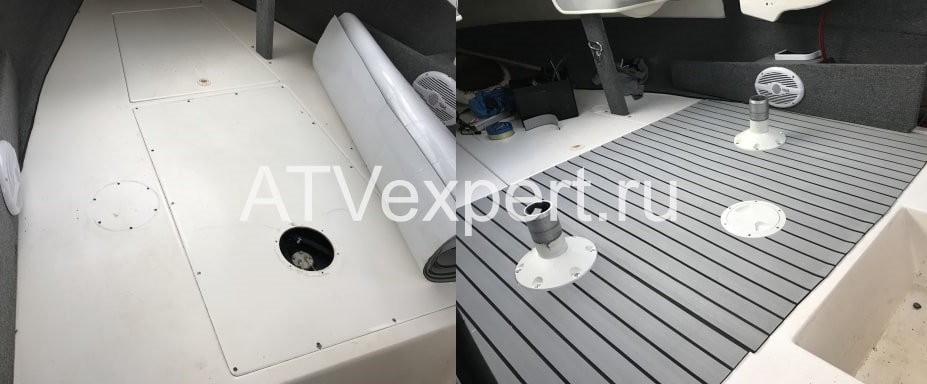Обновление салона катера: перешив сидений, перетяжка элементов интерьера и дооснащение для улучшения эргономики и внешнего вида.