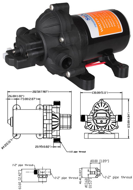 Самовсасывающая диафрагменная электрическая помпа для подачи воды с автоматическим выключателем. Применяется для поддержания давления в бортовой водопроводной системе. Не повреждается при «сухой» работе. Рабочий элемент — 3 диафрагмы. Благодаря создаваемому высокому давлению, может быть использована как помпа для мытья палубы. Штуцеры с водопроводной резьбой.