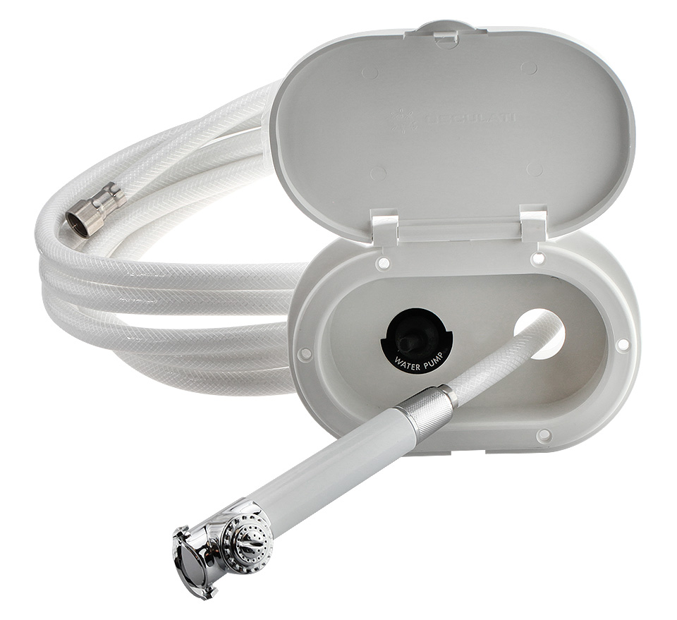 Душевой короб с защищенным от влаги тумблером, шлангом длиной 2,5 или 4 метра и душевой лейкой с дозирующим клапаном. В нерабочем состоянии закрывается крышкой с защелкой. Используется при отсутствии в системе автоматической нагнетательной помпы. Подача воды включается вручную с помощью тумблера.Размеры врезаемой части: 150x80x40 мм;Размеры наружного фланца с крышкой: 185x124 мм.Производитель: «Osculati», Италияbr