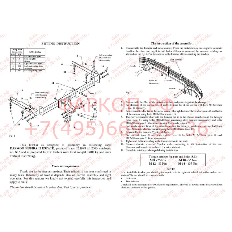 Фаркоп для Daewoo Nubira универсал 1999-2004. Без подрезки бампера. Тип шара: A. Нагрузки: 1200/70 кг, масса фаркопа 16,5 кг