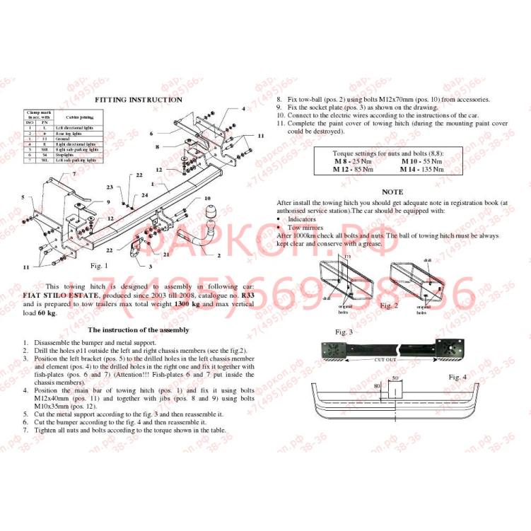 Фаркоп для FIAT Stilo универсал 2002-2008. Требуется подрезка бампера. Тип шара: A. Нагрузки: 1300/60 кг, масса фаркопа 20,8 кг
