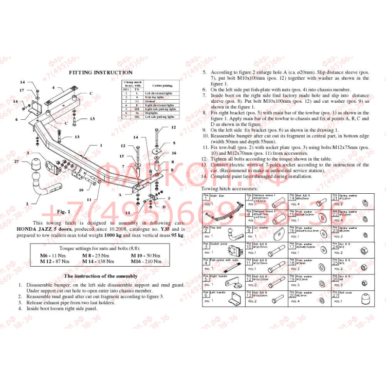 Фаркоп для Honda Fit 2008-2013, Honda Jazz 2008-2014. Требуется подрезка бампера. Тип шара: A. Нагрузки: 1000/95 кг, масса фаркопа 12,8 кг